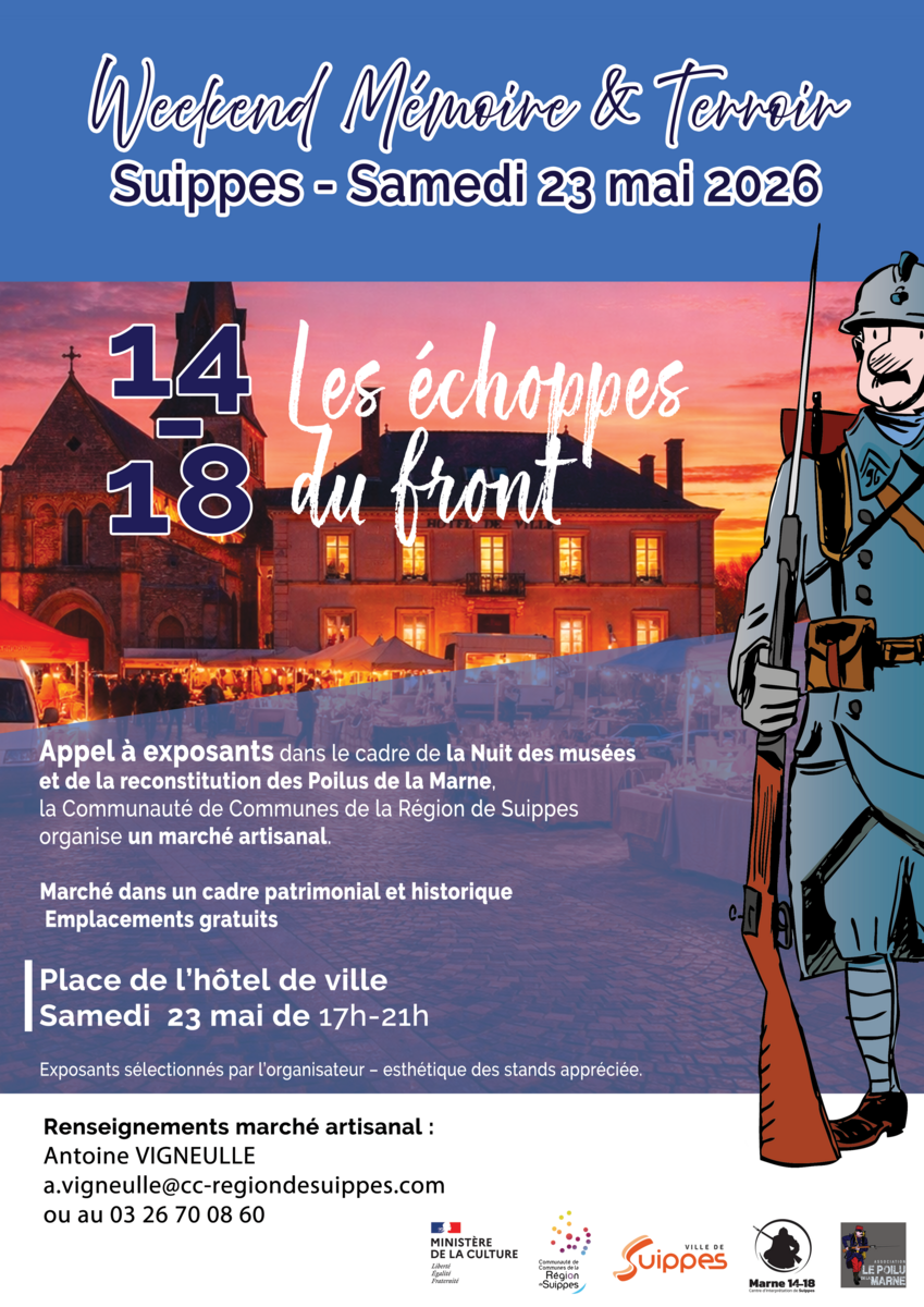 Dans le cadre de la Nuit des Musées et de la reconstitution historique des Poilus de la Marne et du Centre d'interprétation Marne 14-18, la CCRS organise un marché artisanal le samedi 23 mai de 17h à 21h sur la Place de l'Hôtel de Ville à Suippes. Dans ce cadre, la collectivité lance un appel à exposants. Inscription ici : https://cloud.cc-regiondesuippes.com/apps/forms/s/KaLHXBZGQbxYe79f22FEFPtT