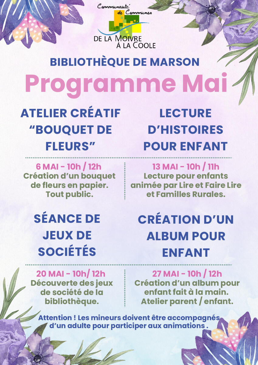 Bibliothèque de Marson 27/4/26 Programme d’animation de la bibliothèque de Marson pour le mois de mai.