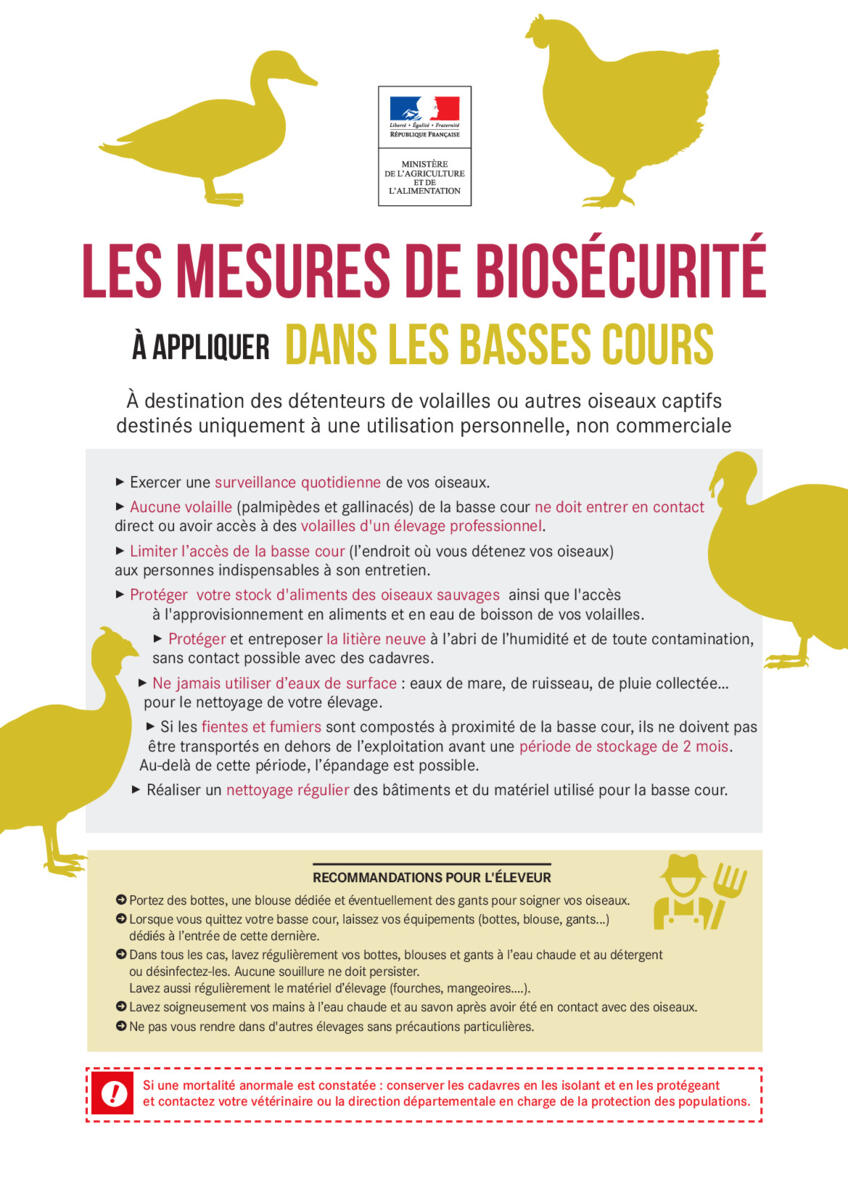 Devant la recrudescence de cas d’influenza aviaire hautement pathogène en Europe dans l’avifaune sauvage et dans les élevages, en tant que détenteurs de volailles ou autres oiseaux captifs destinés uniquement à une utilisation non commerciale, vous devez impérativement mettre en place les mesures suivantes :