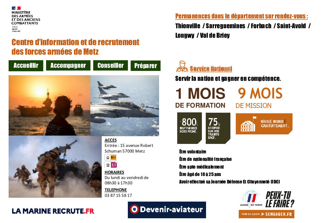Dans le cadre du lancement du service national, le Centre d'Information et de Recrutement des Forces Armées (CIRFA) de Metz organise un forum des métiers de la défense le 26 mars prochain à Moulins-Lès-Metz.