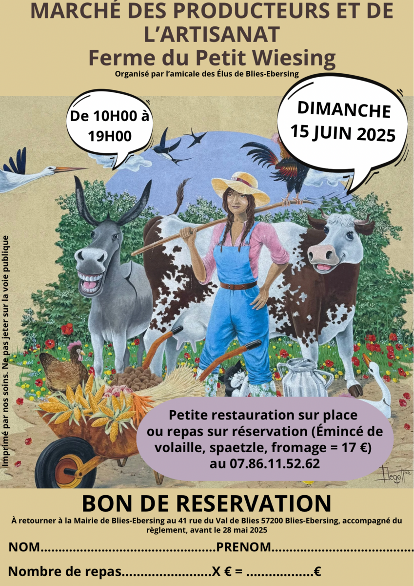 L'Amicale des Elus organise le dimanche 15 juin 2025 un marché des producteurs et de l'artisanat à la Ferme du Petit Wiesing (route de Bitche).