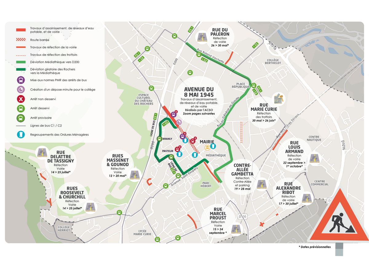 L’intervention la plus importante concernera l’avenue du 8 Mai 1945, où la circulation sera totalement interrompue de mai à juillet. Ce chantier, piloté par l’Agglomération Creil Sud Oise, entraînera la mise en place de déviations.