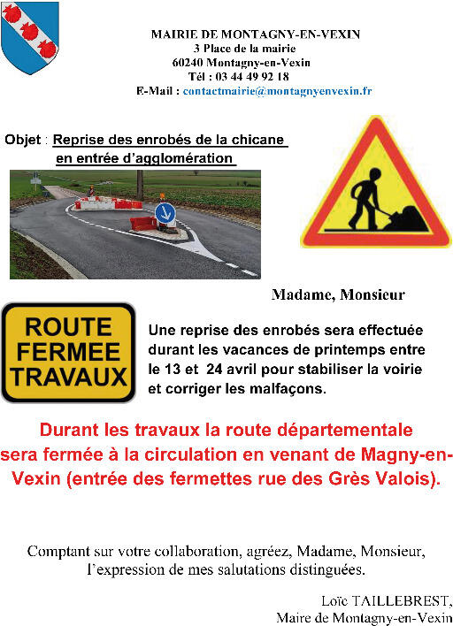 ROUTE FERMEE POUR TRAVAUX DU 13 au 24 AVRIL 2026