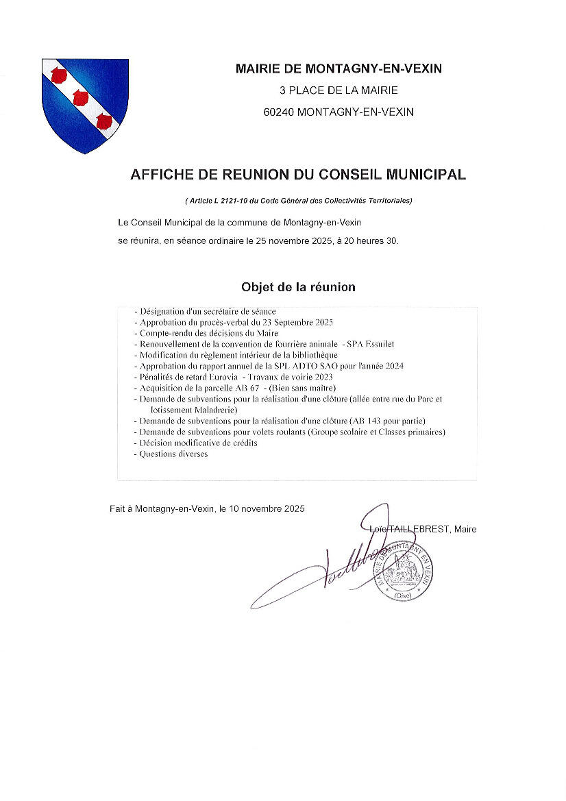REUNION DU CONSEIL MUNICIPAL LE 25 NOVEMBRE 2025 à 20H30