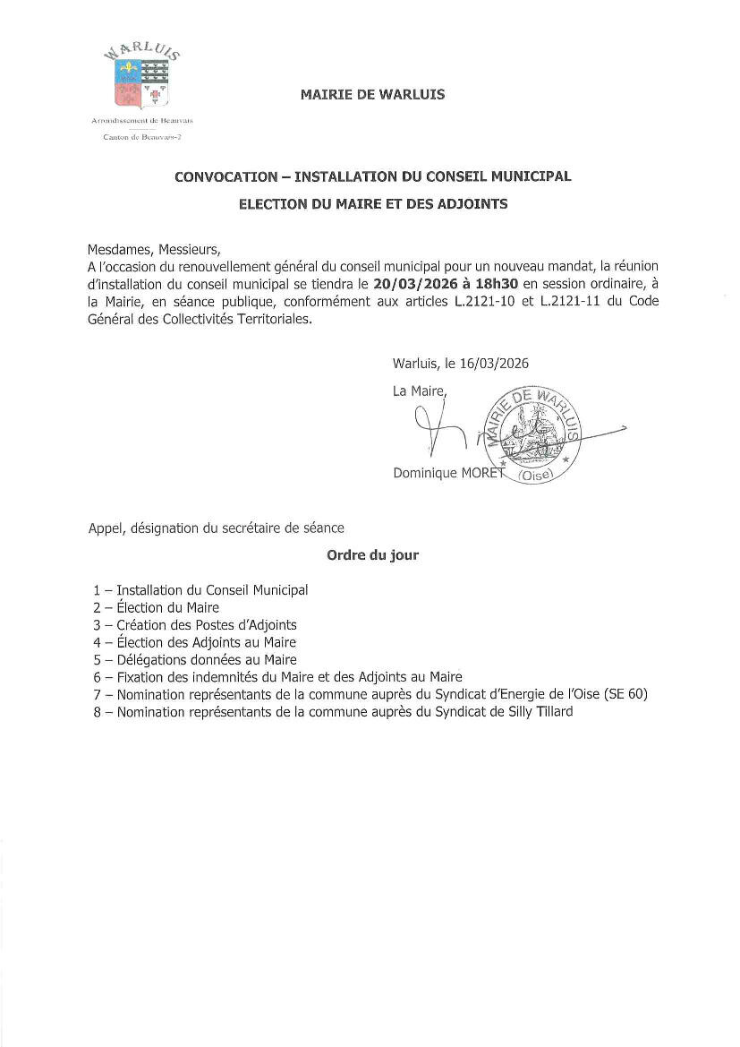 Le nouveau Conseil Municipal est convoqué vendredi 20 mars 2026 à 18h30 à la mairie pour son installation.