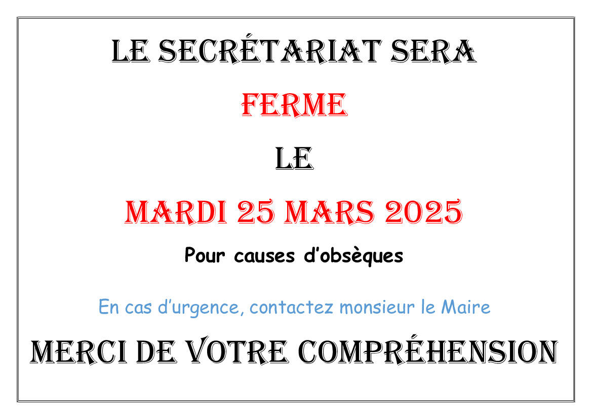 Le secrétariat sera fermé le mardi 25 Mars 2025