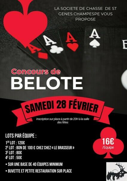 🃏 Concours de belote de la société de chasse 🃏 28/2/26 🃏N'oubliez pas à vos cartes et vos tapis ! Source : Mairie de Saint-Genès-Champespe