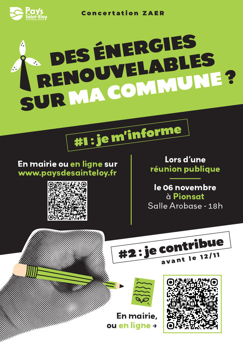 Dans ce cadre, une concertation publique est organisée jusqu'au 12 novembre 2025 dans toutes les communes et une réunion publique se tiendra le jeudi 6 novembre à Pionsat (18h - salle Arobase) pour vous informer précisément sur le sujet.
