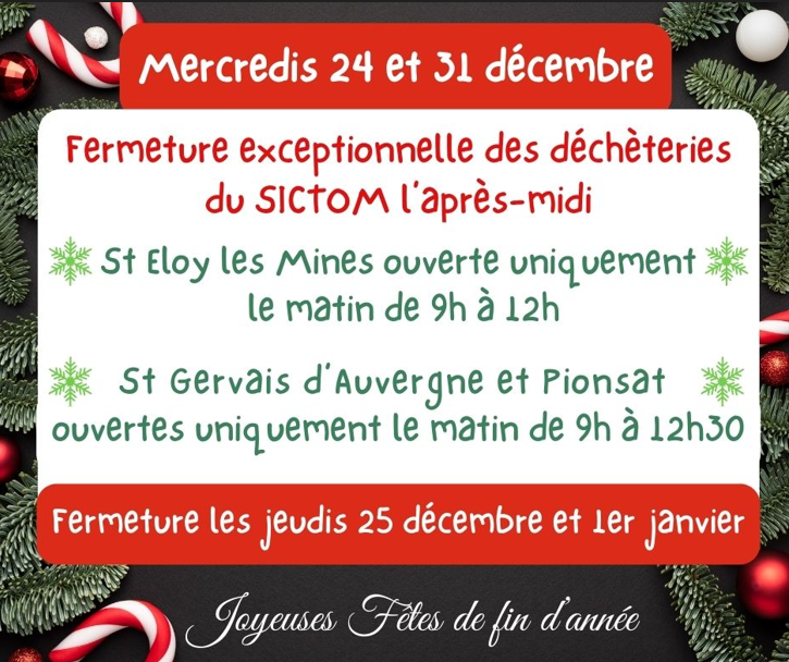 ❌ Les déchèteries de St Eloy les Mines, St Gervais d’Auvergne et Pionsat seront exceptionnellement fermées les mercredis 24 et 31 décembre après-midi.