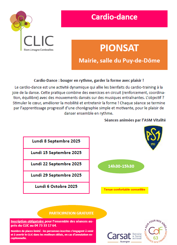 Le CLIC Riom Limagne Combrailles en partenariat avec les communes accueillant l’action, vous propose de nouveaux ateliers cardio-dance, animĂ©s par l’ASM VitalitĂ©.