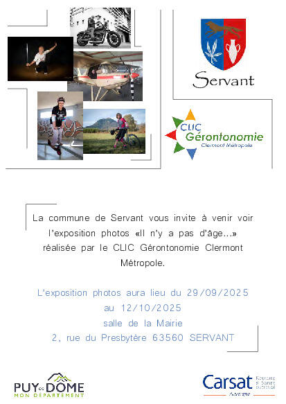 La commune de Servant vous invite à venir voir l’exposition photos «Il n’y a pas d’âge...» réalisée par le CLIC Gérontonomie Clermont Métropole.