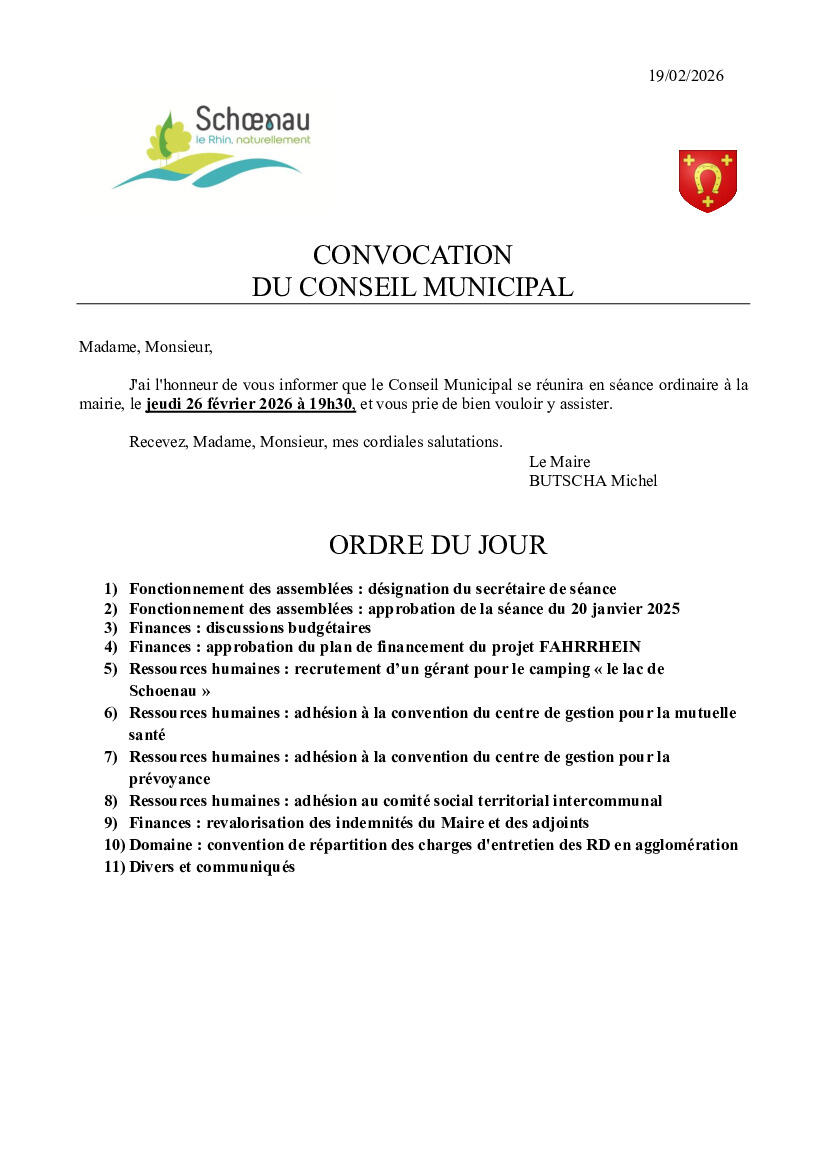 Ordre du jour conseil municipal du 26 février 2026 20/2/26 Le conseil municipal se réunira le jeudi 26 février à 19h30 à la mairie.