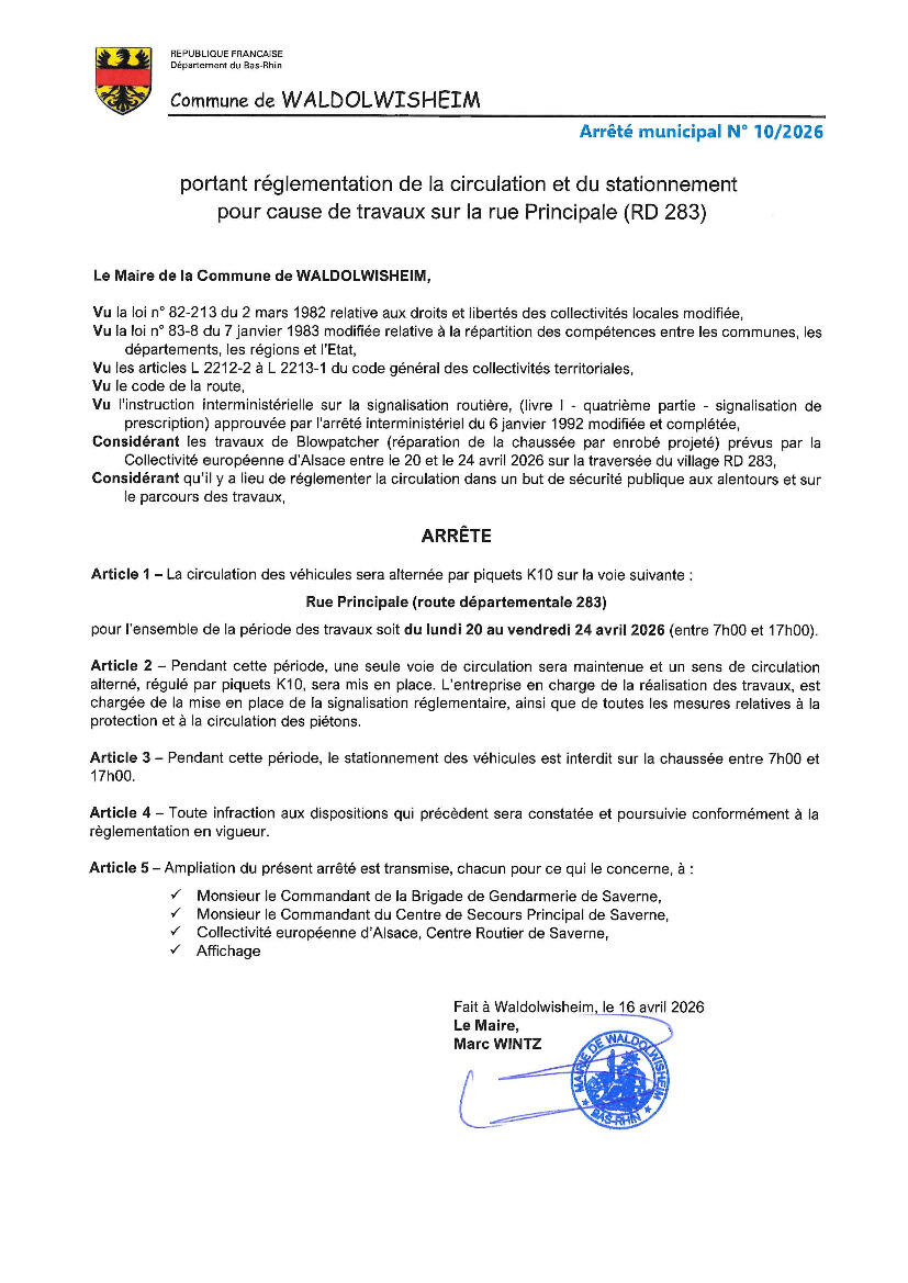 Dans le cadre de l’entretien courant des routes départementales, la Collectivité européenne d’Alsace (CEA) procédera à des travaux de réparation de la chaussée rue Principale. Ces interventions seront réalisées par enrobé projeté (technique « Blowpatcher ») sur des zones ciblées.