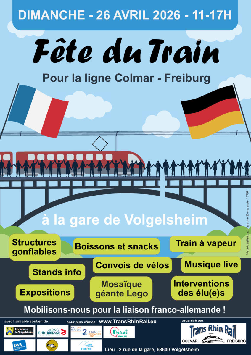L'association Trans Rhin Rail qui milite depuis de nombreuses années pour la réouverture de la ligne ferroviaire Colmar/Fribourg organise le dimanche 26 avril une grande fête familiale à la gare de Volgelsheim de 11 h à 17 h 30.
