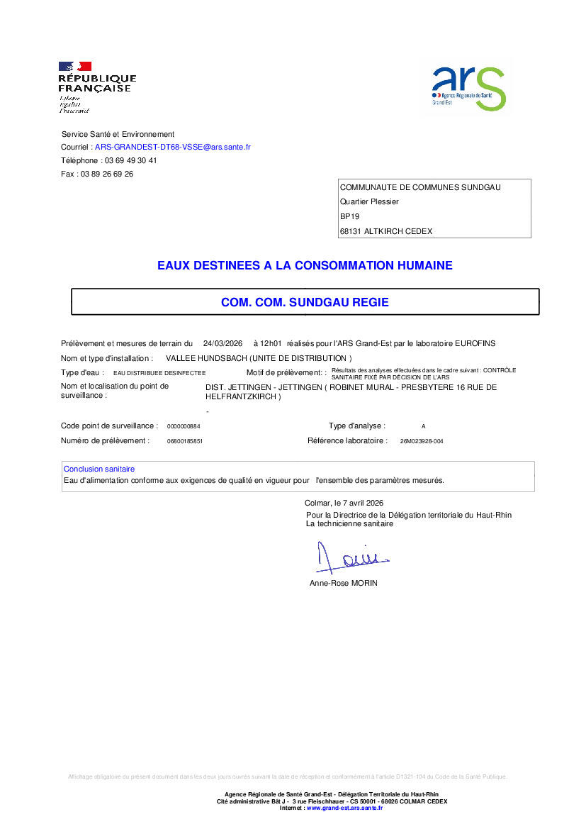 ARS - Résultats d'analyses de l'eau 2026