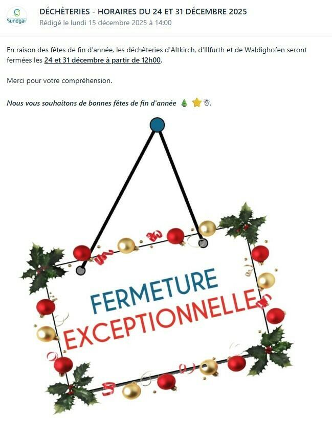 FERMETURE EXCEPTIONNELLE DU 09/12 - DÉCHÈTERIES