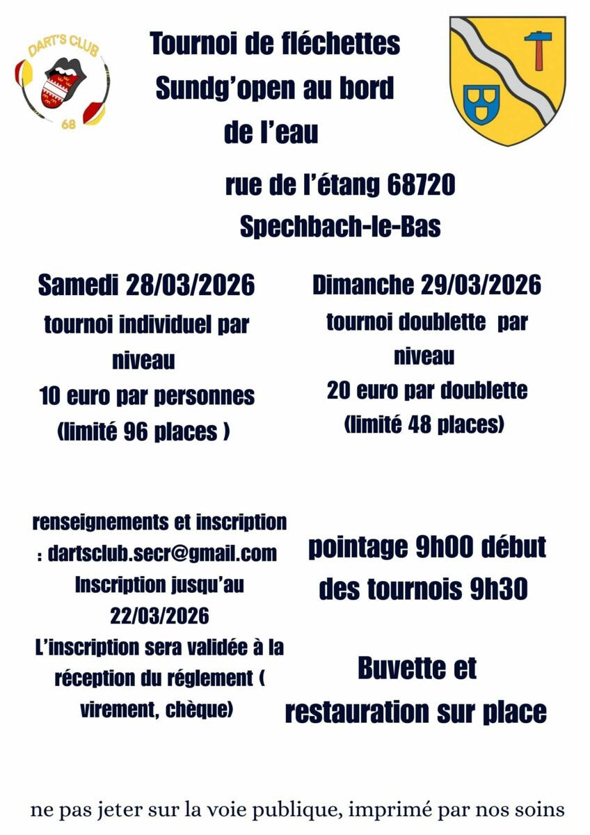 🎯 Le DART’s CLUB 68 organise son 3ème « SUNDG'OPEN » de fléchettes au chalet de l’étang de Spechbach, le 28 mars en tournoi individuel (tarif 10€) et le 29 mars en tournoi doublette (20€) 🎯