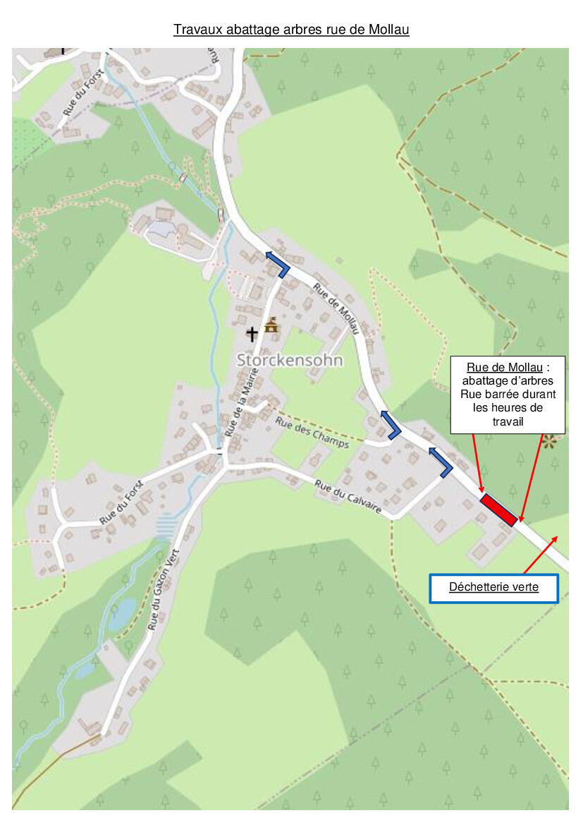 La semaine du 9 février au 14 février 2026 inclus se dérouleront les travaux de coupe d’arbres sur la Rue de Mollau au niveau du numéro 24 (voir plan ci-joint).