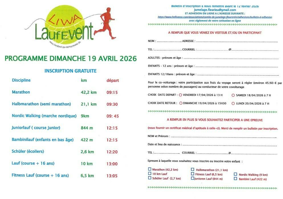 RDV SPORTIF A LICHTENWALD LiwaLaufEvent Marathon, semi-marathon, courses 10km, 6,5km, pour les enfants 2,6km, 844m et 422m, marche nordique 9km Inscription avant le 12 février 2026 : flyer ci-joint