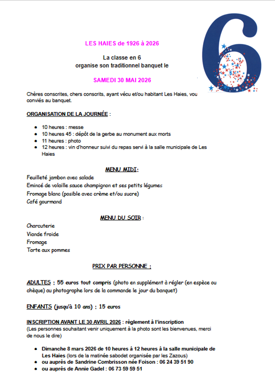 Les personnes intéressées pour le banquet des classes en 6 aux Haies qui aura lieu samedi 30 mai 2026, peuvent s'inscrire avant le 30 avril, soit :