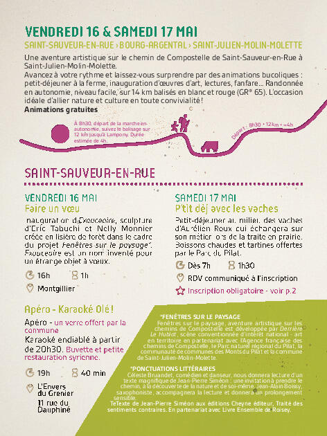 Vendredi 16 mai et samedi 17 mai 2025, embarquez pour une randonnée artistique sur le chemin de Compostelle (GR®65) depuis St-Sauveur-en-Rue jusqu’à St-Julien-Molin-Molette !