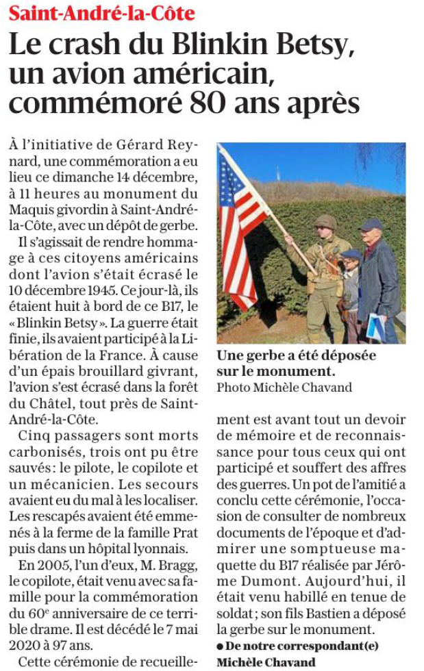 Je souhaite remercier très chaleureusement les habitants qui ont répondu présents à l’invitation pour la commémoration du crash du B‑17, ce dimanche 14 décembre.