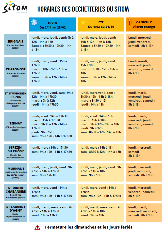 Conformément à cette alerte préfectorale orange et au règlement des déchetteries, et afin de protéger les gardiens des déchetteries et les usagers, les déchetteries du SITOM seront fermées les après-midis.