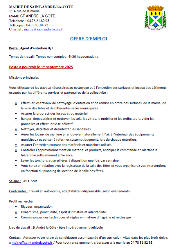 !!!Offre d'emploi Agent d'entretien à Saint André la côte!!!