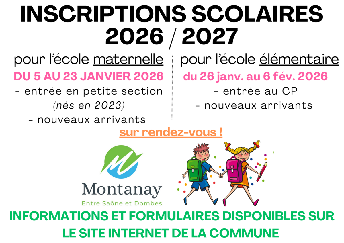 Les inscriptions se feront uniquement sur rendez-vous. Le formulaire en ligne pour accéder à la prise de rendez-vous est accessible sur notre site internet : https://www.commune-montanay.fr/grandir-a-montanay/ecoles/inscription-scolaire/