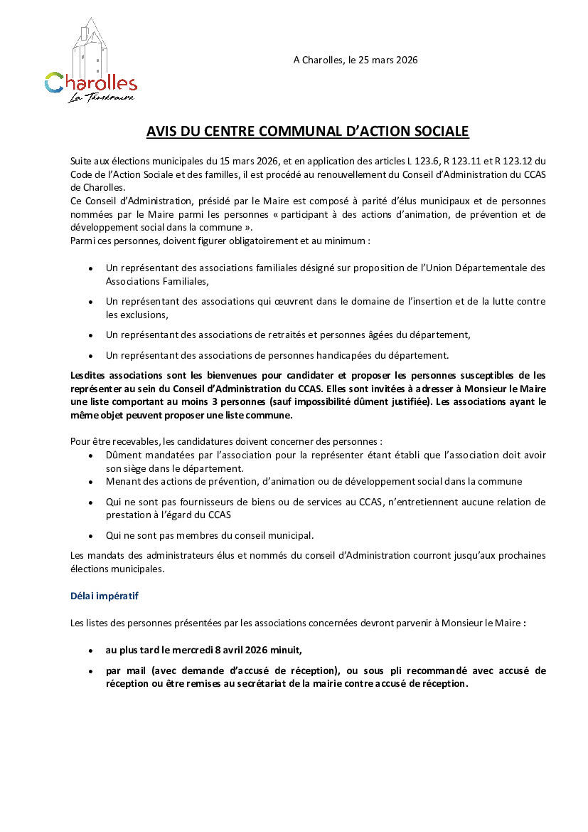 Suite aux élections municipales du 15 mars 2026, et en application des articles L 123.6, R 123.11 et R 123.12 du Code de l’Action Sociale et des familles, il est procédé au renouvellement du Conseil d’Administration du CCAS de Charolles.