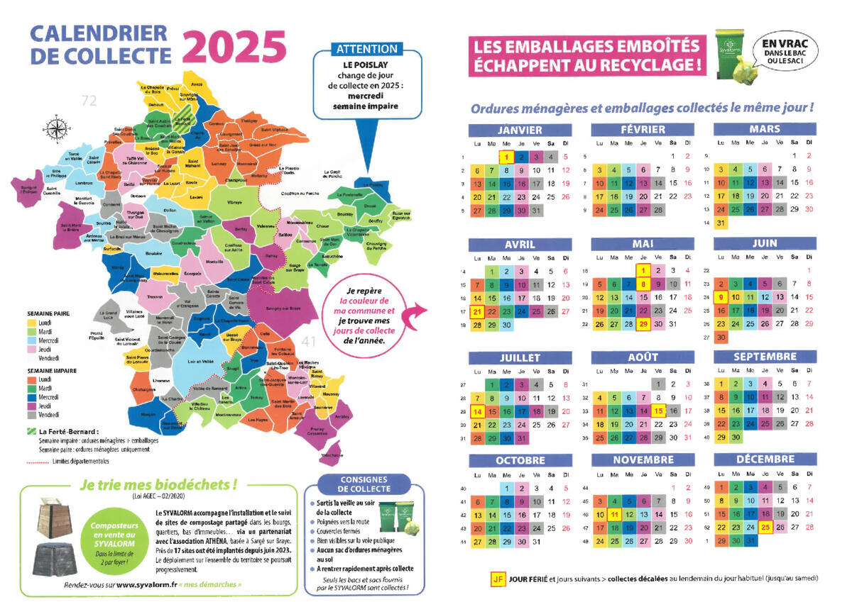 En cas de jour férié dans la semaine, les collectes sont décalées au lendemain du jour habituel, jusqu’au samedi inclus.