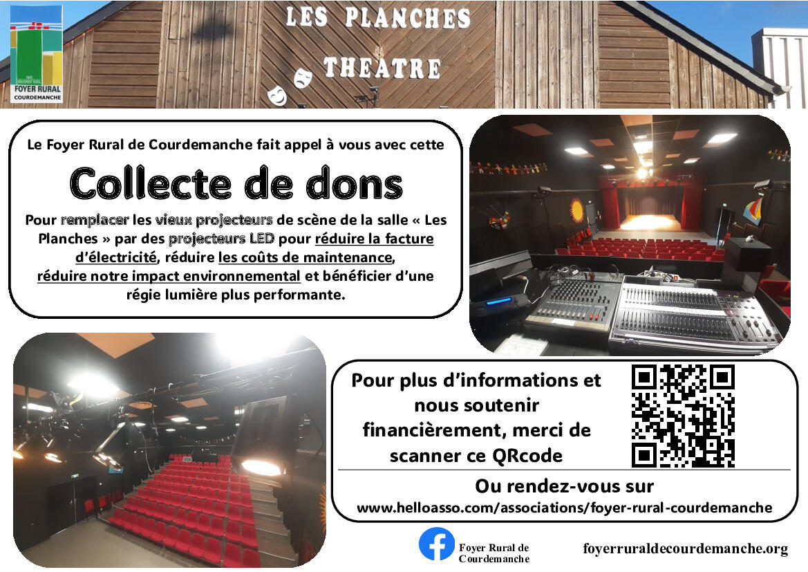Pour plus d’informations et nous soutenir financièrement, rendez-vous sur https://www.helloasso.com/associations/foyer-rural-courdemanche/collectes/foyer-rural-courdemanche-eclairage-scenique-salle-les-planches