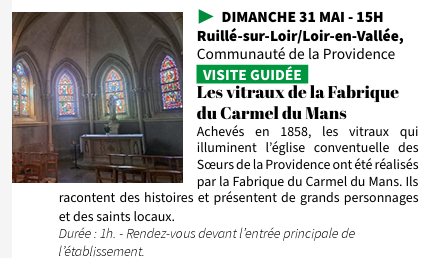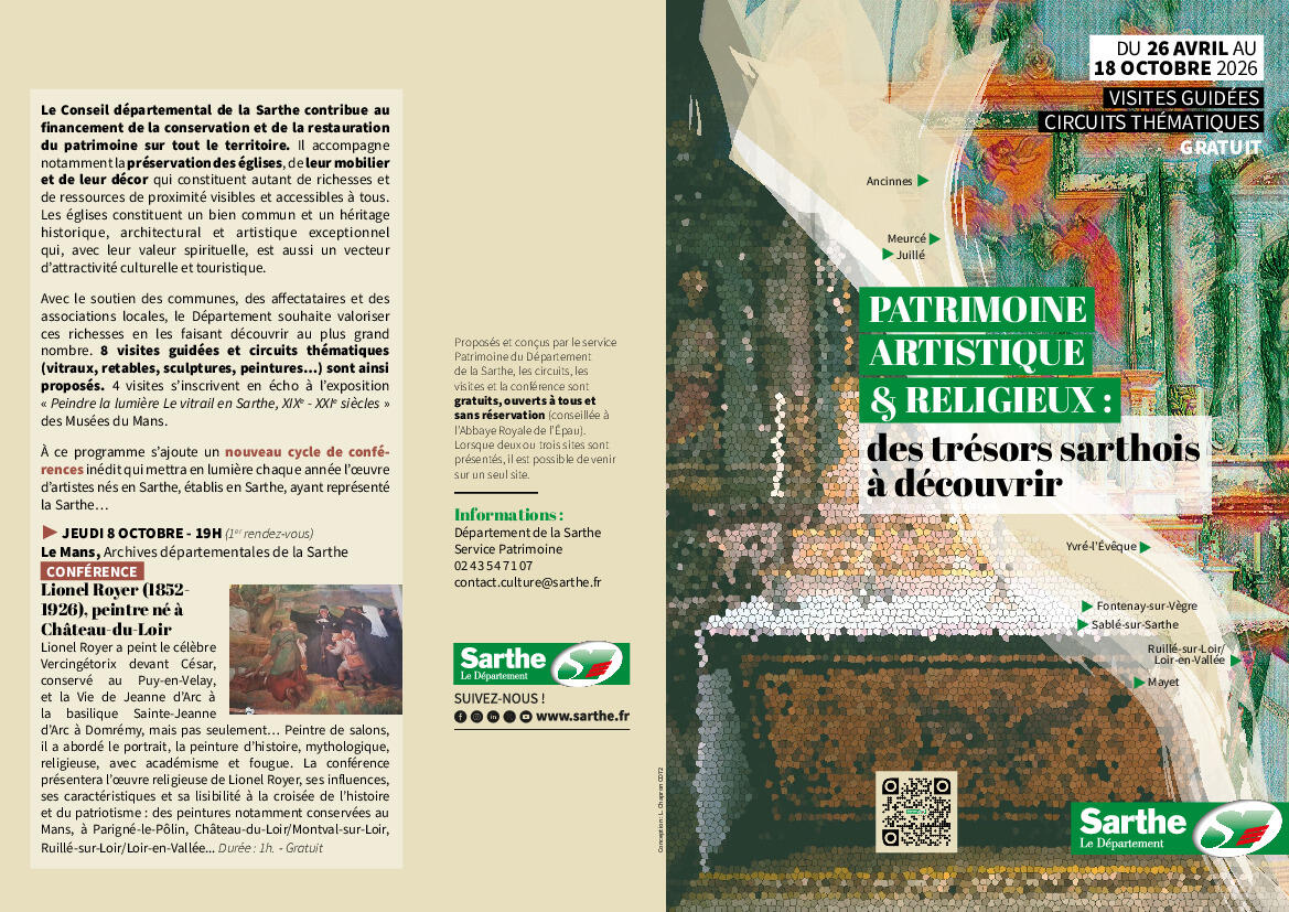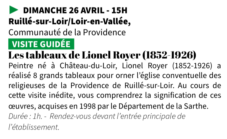 Le département organise des visites gratuites sur le patrimoine artistique et religieux de la Sarthe entre le 26 avril et le 18 octobre 2026, dont deux à Ruillé les 26 avril et 31 mai à 15h à la communauté de la Providence (gratuite). Rendez-vous à 15h, durée une heure.