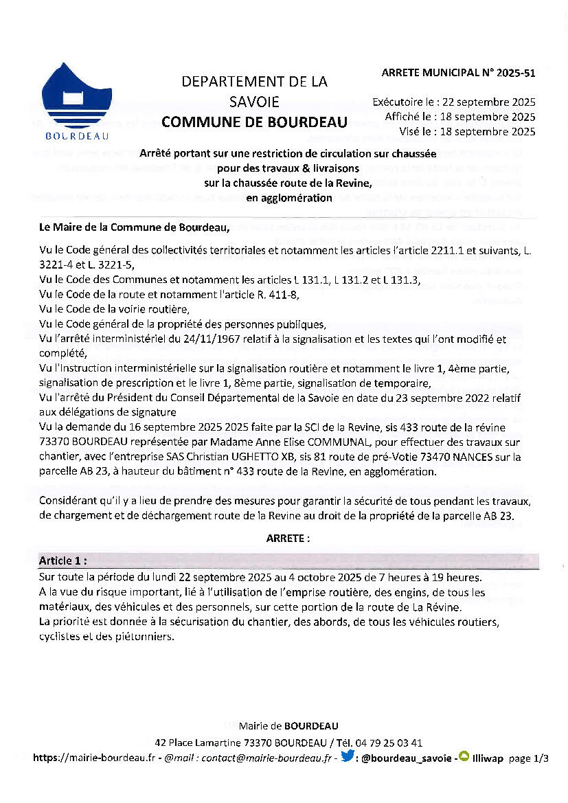 A la vue du risque important, lié à l’utilisation de l’emprise routière, des engins, de tous les matériaux, des véhicules et des personnels, sur cette portion de la route de La Révine.