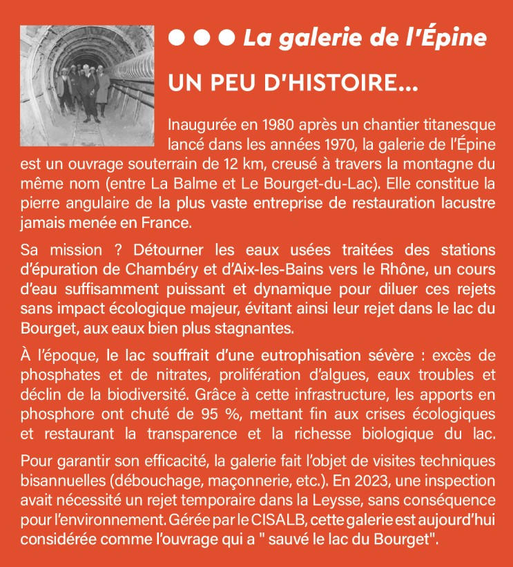 Le CISALB (Comité Intercommunal du Lac du Bourget), informe les habitants et usagers d’une fermeture provisoire de la galerie de rejet de l’Épine, prévue du 3 au 23 octobre 2025. Cette interruption, néces­saire pour réaliser une inspection technique approfondie, entraînera un rejet temporaire des effluents traités des stations d’épuration de Grand Chambéry et de Grand Lac dans la Leysse, au niveau de la passerelle aux Dames.