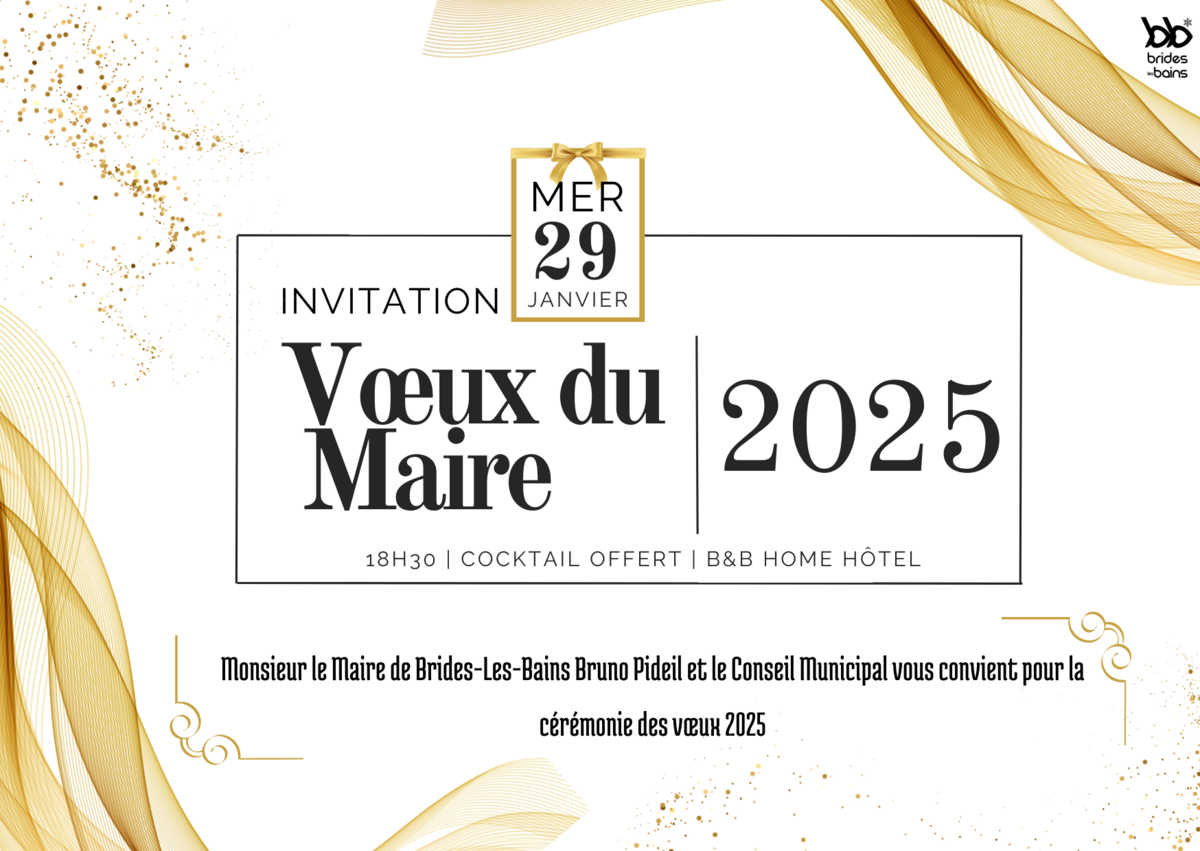 Monsieur Le Maire de Brides-les-Bains et le Conseil Municipal vous convient pour la cérémonie des voeux 2025 qui aura lieu au: