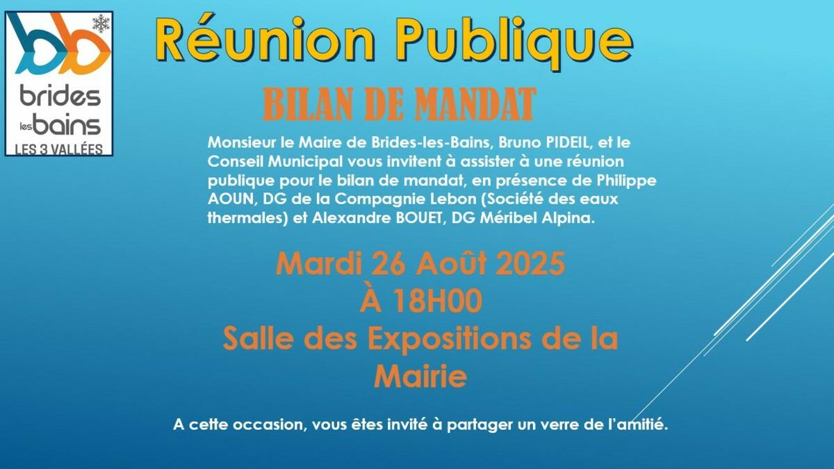 Monsieur le Maire de Brides-les-Bains, Bruno Pideil, et le Conseil Municipal vous invitent à assister à une réunion publique pour le bilan de mandat, en présence de Philippe AOUN, Directeur Général de la Compagnie Lebon ( Société des Eaux Thermales) et Alexandre BOUET, Directeur Général Méribel Alpina.