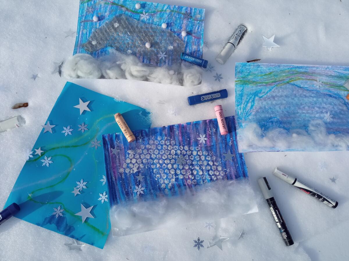 Un ours polaire fait de bulles a le regard perdu dans les aurores boréales tout en marchant sur une neige de coton. Voilà de quoi faire rêver les tout jeunes artistes lors de cet atelier peinture et collage. Ton ours aux aurores boréales n’attend que toi pour être créé.