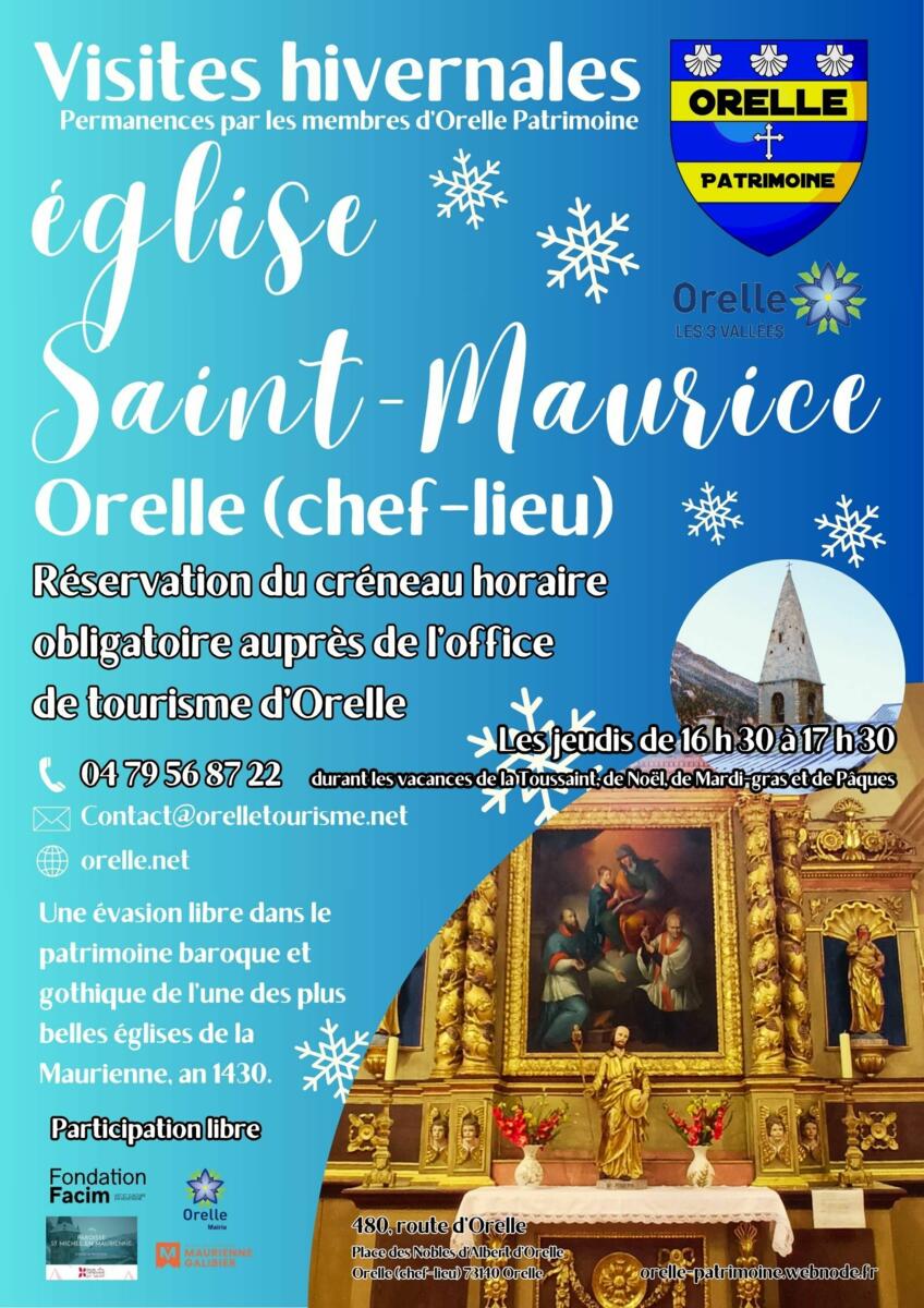 Les visites hivernales de l'église Saint-Maurice d'Orelle continuent en ces vacances de Noël. L'association Orelle Patrimoine propose aux visiteurs de venir admirer la beauté de l'édifice baroque et gothique le jeudi 25 décembre 2025 et le jeudi 1er janvier 2026. Les guides de l'association du patrimoine vous ouvrent le monument incontournable du patrimoine de la Savoie, le tout en musique puisqu'un membre de l'association du patrimoine propose quelques notes de Noël grâce à l'harmonium du chœur. Les créneaux de visites sont ouverts de de 16 h 30 jusqu'à 17 h 30 sur réservation préalable auprès de l'office de tourisme d'Orelle (orelle.net). Toutes les informations sur : https://orelle-patrimoine.webnode.fr. Je remercie chaleureusement Yvonne Thomas, Christine Gauci et Hervé Girard pour la tenue de ces visites, ainsi que l'office de tourisme d'Orelle et la mairie d'Orelle pour la communication.