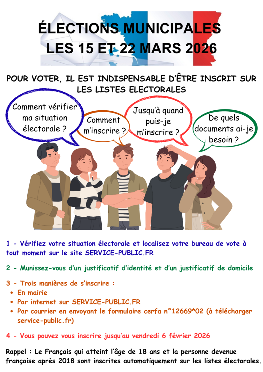 Pour les personnes qui ne sont pas encore inscrites sur la liste électorale, vous pouvez le faire en ligne ICI  jusqu'au 6 février 2026 ou en déposant en mairie le formulaire cerfa n°12669*02 accompagné d'une pièce d'identité et d'un justificatif récent de domicile.