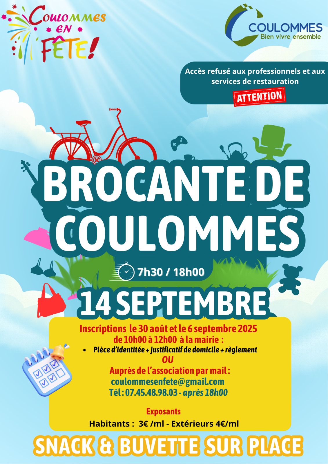 🫵​🫵​ Brocante à Coulommes le 14 septembre 🫵​🫵 7/9/25 👍​ Venez nombreux ! Source : Mairie de Coulommes