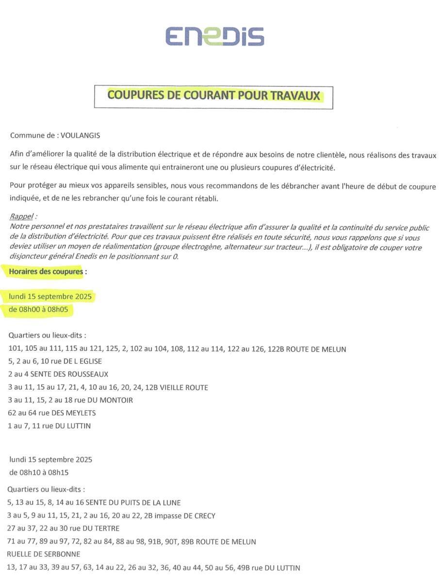 ENEDIS effectuera des coupures de courant le lundi 15 septembre entre 8h et 8h15 dans certains quartiers de la commune.