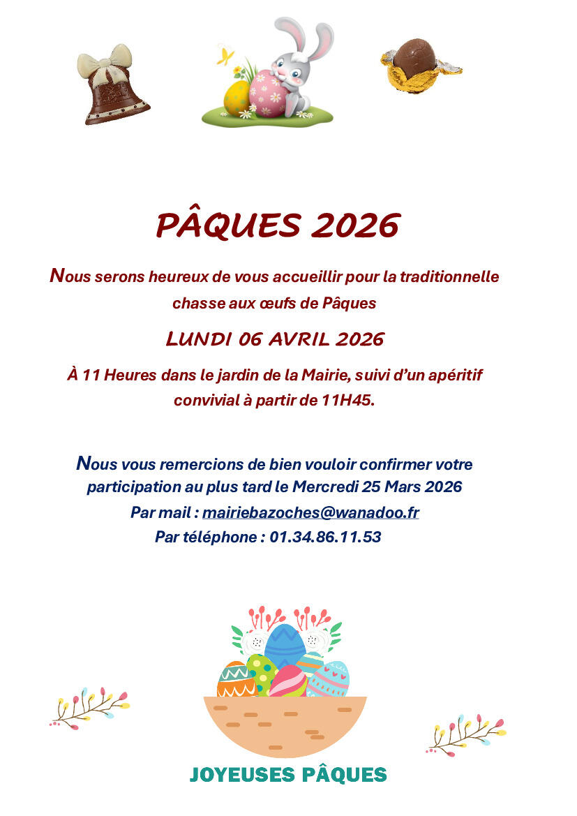 Nous serons heureux de vous accueillir pour la traditionnelle chasse aux œufs de Pâques le LUNDI 06 AVRIL 2026 à partir de 11 Heures dans le jardin de la Mairie, suivi d’un apéritif convivial vers 11H45.