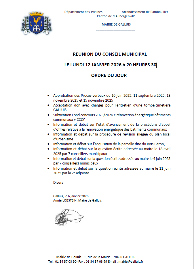 Le conseil municipal se réunira le lundi 12 janvier 2026 à 20h30.