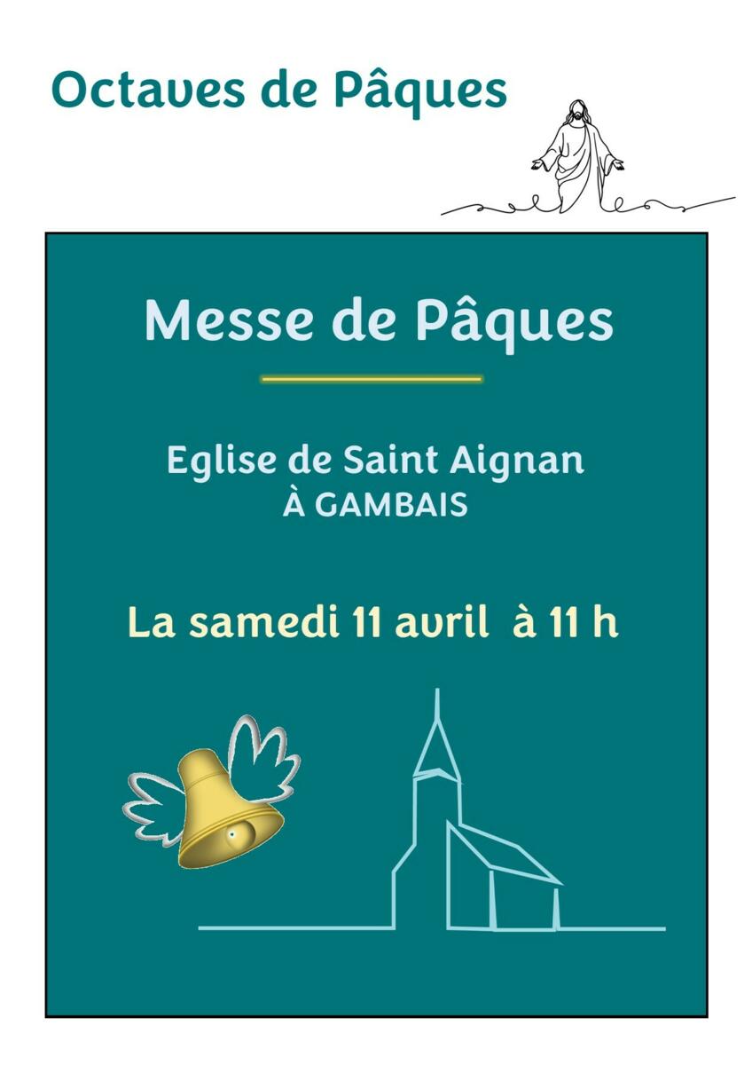 Les catholiques du pays Houdanais nous informent, qu'une messe de Pâques se tiendra samedi 11 avril à 11h à l'église de Saint Aignan.