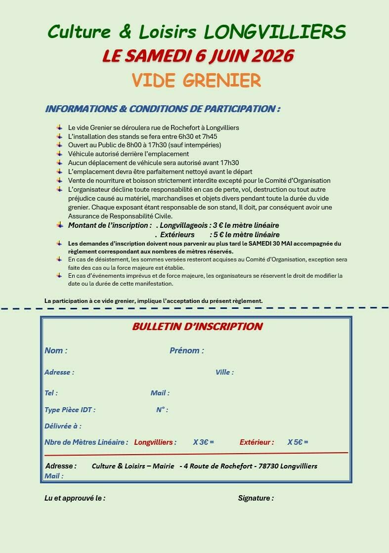 Su ayuntamiento / Noticias / Vide grenier à Longvilliers - 6 juin 2026 - Inscriptions