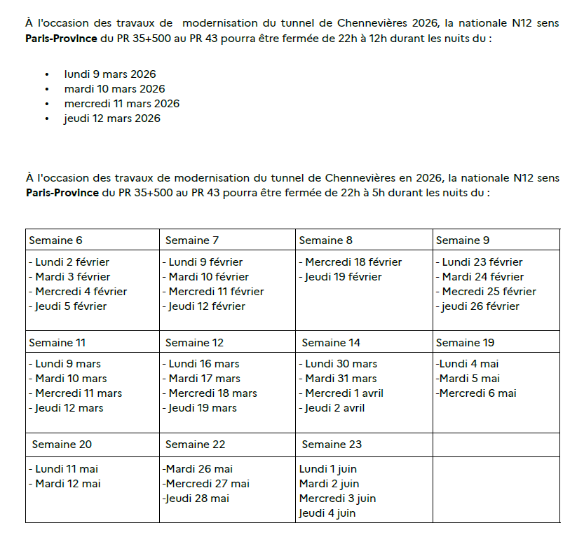 [Tunnel de Chennevières] Arrêté N12 - Fermetures Nuits 2026