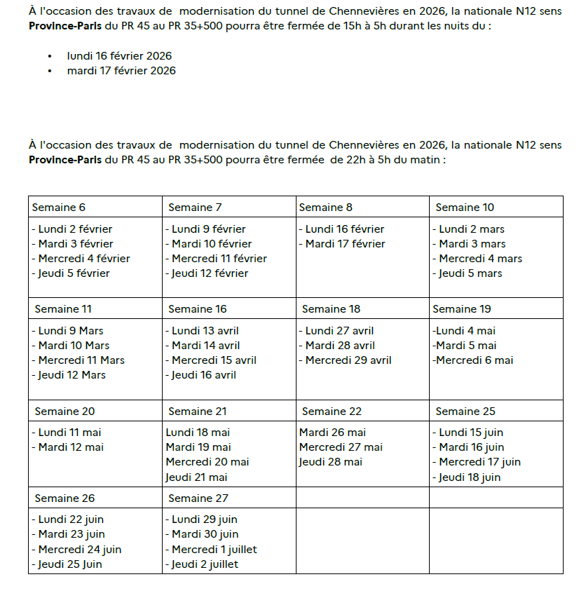 Su ayuntamiento / Noticias / [Tunnel de Chennevières] Arrêté N12 - Fermetures Nuits 2026