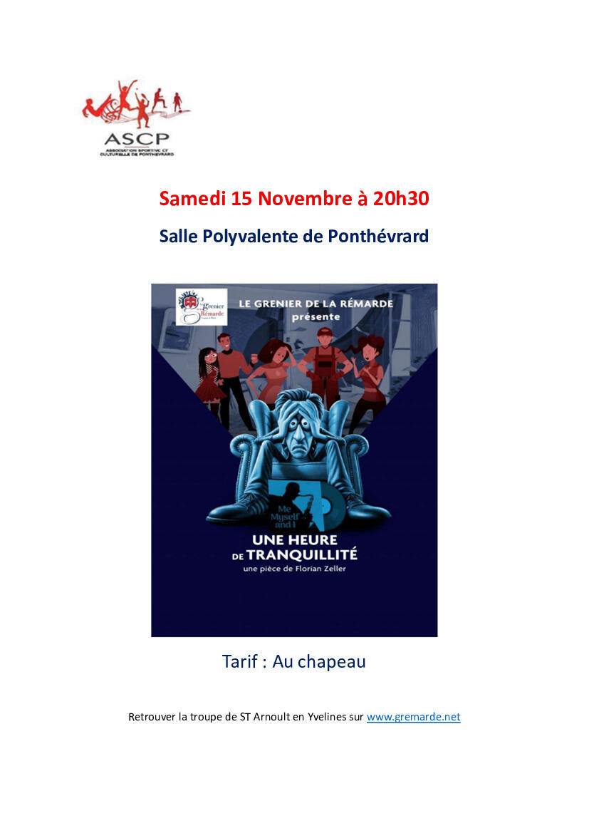 Théâtre à Ponthévrard 13/11/25 Le Grenier de la Rémarde vous propose Une heure de tranquilité le samedi 15 novembre dans la salle polyvalente de Ponthévrard