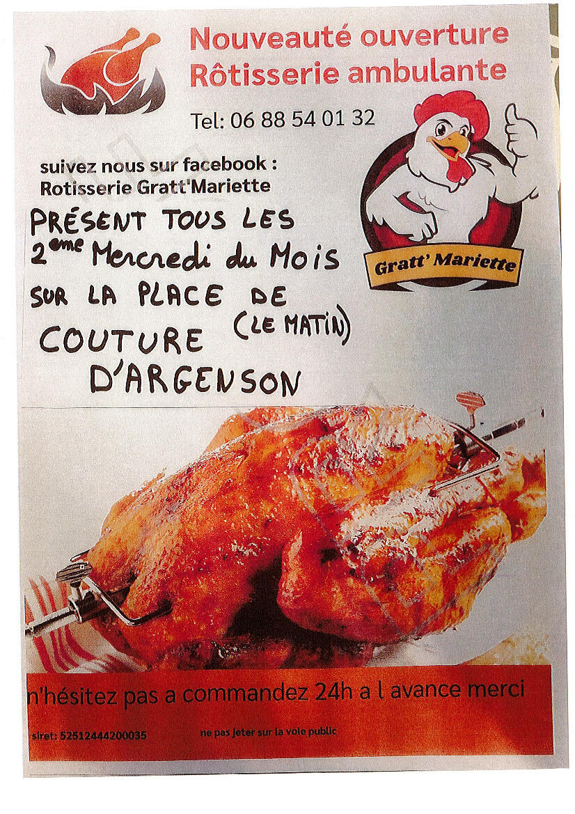 Rôtisserie ambulante présente le 2ème mercredi du mois (le matin) sur la place de Couture d'Argenson.